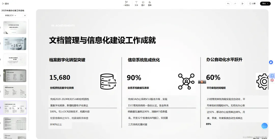 比如,我随便测试让它做一份工作总结的ppt,选择一个模板后,就生成了图文并茂、风格统一的一套PPT。全程几乎不用调提示词,视觉一致性也很好。