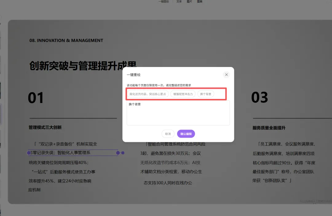 同时,对做出来的PPT,需要修改单页时,还可以一键重绘,一键重绘预置了一些提示用语,比如:“简化这页内容,突出核心要点” “增强视觉冲击力”“换个背景”等,你直接点击就可以重新修改,非常贴心!