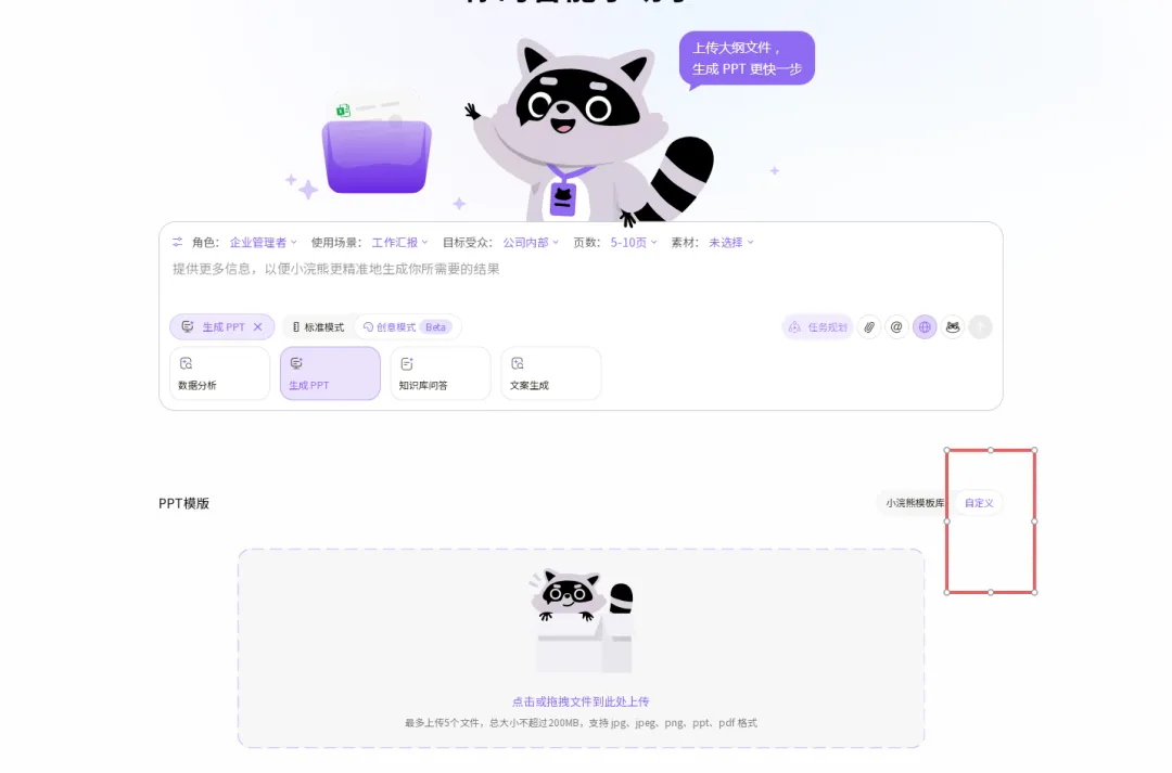 除了小浣熊模板库之外,还可以自定义模板,你有喜欢的模板风格的PPT,可以直接自定义,发给小浣熊,让它按照你上传的风格来做。