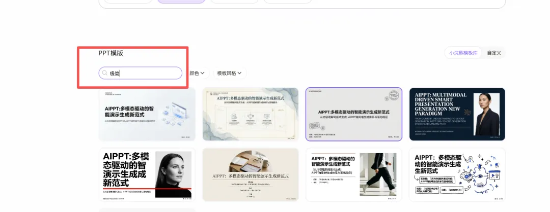 本次上线了不少实用的PPT 模板,需要什么风格的模板,可以直接搜索,比如,我搜索“极简”两字,就跳出了极简的高质量模板。这次升级,有一个很大的亮点,那就是支持异步生成和完成提醒。