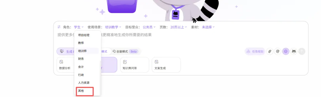 整体来看,办公小浣熊的PPT功能还是很细致和全面的。单是PPT这个界面,就直接有角色,使用场景、目标受众、页数、素材等选项,考虑的很全面,这样,我们在写提示词的时候,就简化了步骤,不用再写很长的提示词。在角色,使用场景、目标受众、页数、素材等选项中,点击选项右边的紫色字体,还选择更多的细分场景。比如,点击角色右边的紫色字体,可以选择相应的角色,如果没有你要的角色,点击其他可以直接改为你需要的角色。除了PPT之外,我也试了一下它的其他功能,比如数据分析,数据可视化,任务规划,文档编辑等都很能打。