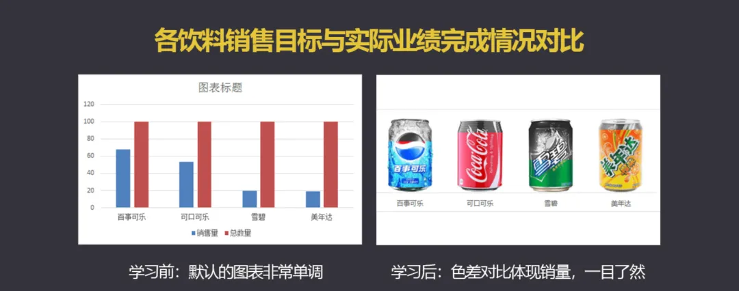 本节课,我们就用饮料的销售量为例,制作一个图表来直观呈现出不同品牌饮料的销售量对比情况,掌握了这个知识点,你就可以活学活用,制作出其他同类型的图表了: