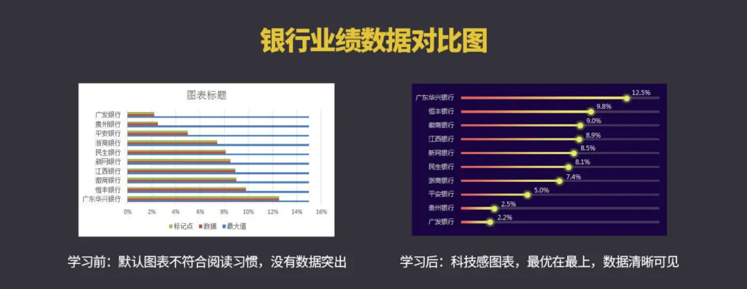此外,小编还会教你认识柱形图的“好兄弟”——条形图,制作出充满科技感的各大银行业绩数据对比图表,这类图表在实际生活或工作中也非常常见,学会这一点,遇到多数据需要在图表中展现的情况,你就可以用条形图来巧妙的解决了: