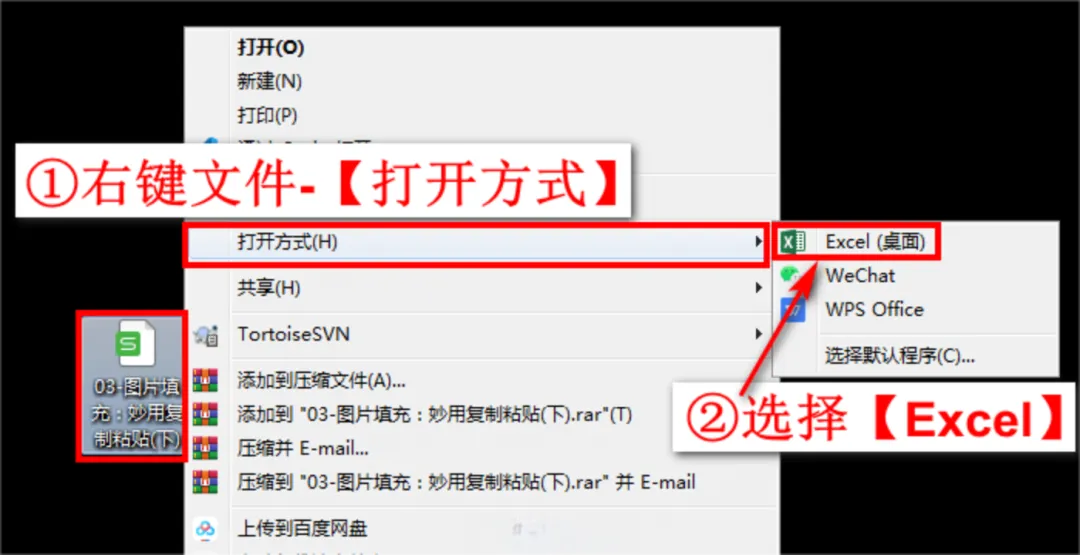 首先,右键刚刚下载的素材《03-图片填充:妙用复制粘贴(下)》,在打开方式中还是选择使用Excel打开,即我们统一使用office 2016版本来实操,以达到更好的学习效果,如下图: