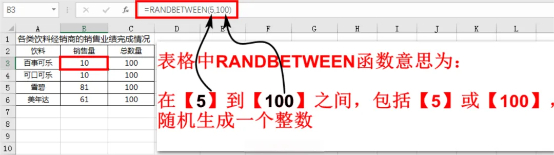 小编在此先行说明一下,表格中小编为了更快生成模拟数据,在B列即“销售量”一列,用到了一个名叫RANDBETWEEN的函数,它的意思是:返回大于等于指定的最小数,小于等于指定最大数之间的一个随机整数;每次计算工作表时都将返回一个新的数值。如下示意图: