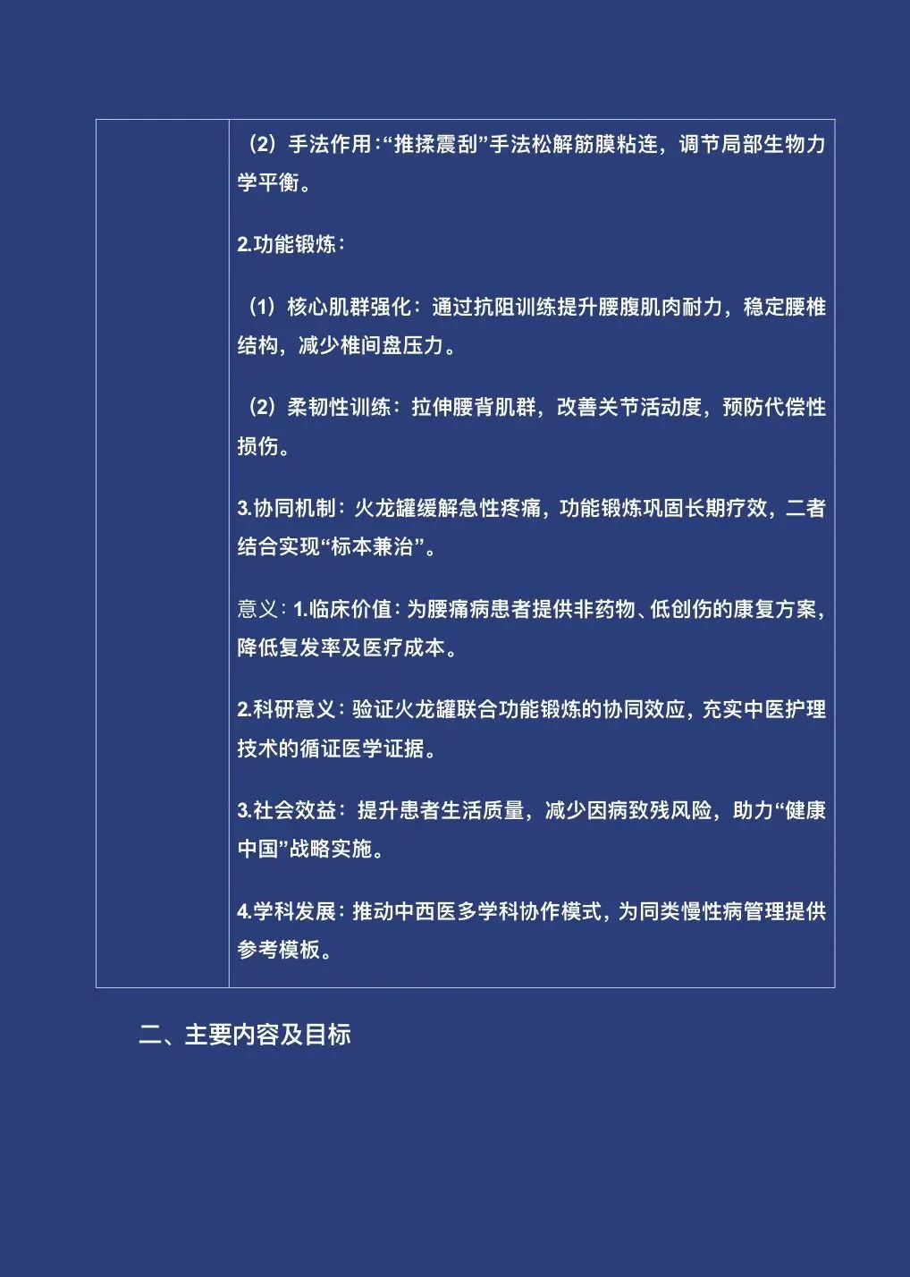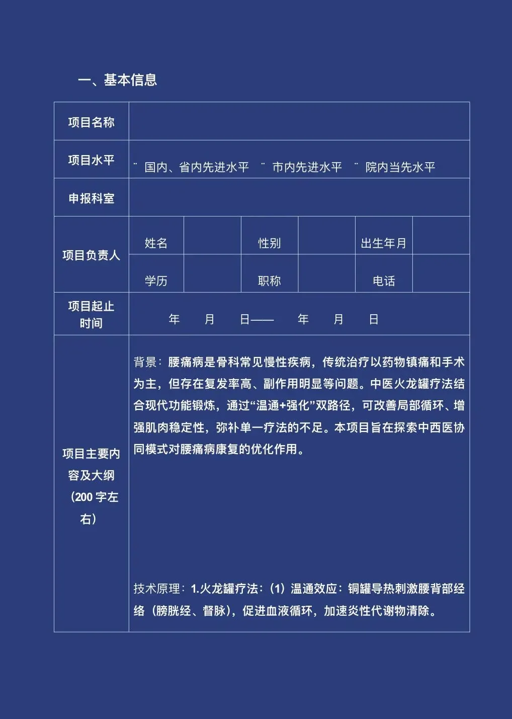 本申报书是xx市中医医院针对腰痛病的“一科一品”卓越护理服务项目申报材料,拟以院内先进水平开展,探索火龙罐疗法联合现代功能锻炼的中西医协同康复模式。项目筛选8例符合标准的腰痛病患者,规范开展火龙罐操作及核心肌群、柔韧性功能锻炼,搭配穴位贴敷辅助治疗;分基线期、强化期、巩固期三阶段实施,组建多职能团队分工协作,完成伦理、设备等审批,预算约2.5万元。设定2周、4周短期与长期康复目标,旨在为腰痛病提供非药物低创伤方案,充实中医护理循证证据,推动中西医协作发展。