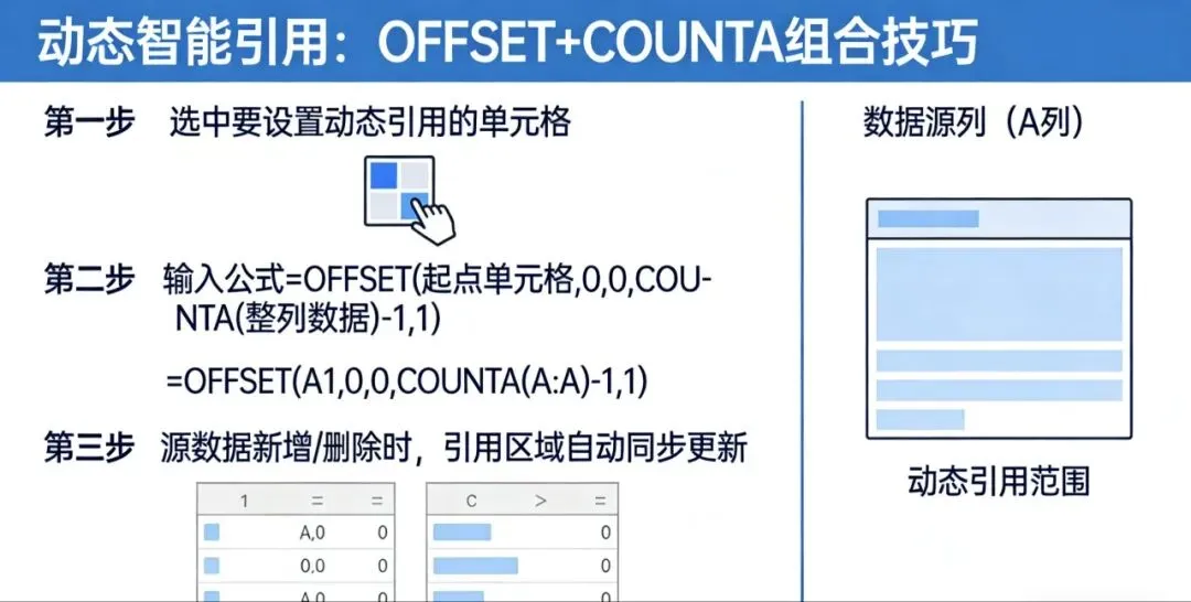 只会固定区域引用,数据一增加公式就失效?OFFSET+COUNTA组合,能自动识别最后一行数据,做成真正的动态引用区域,做图表、做汇总、做下拉菜单都永不掉队。