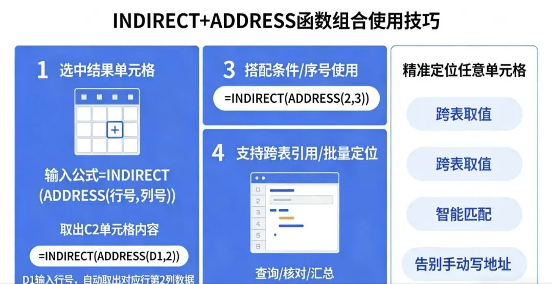 想根据行号列号自动取出对应内容?INDIRECT+ADDRESS组合,把行号+列号变成真实单元格引用,实现精准定位、跨表取值、智能匹配,告别手动写地址。
