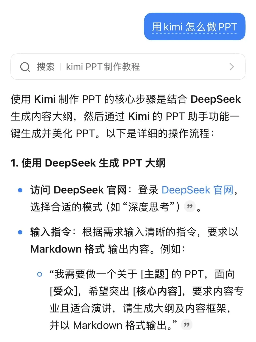 别说,Kimi真不含糊,给出了和录制视频的小朋友几乎一样的答案,只不过Kimi推荐的生成PPT大纲的AI是DeepSeek。鉴于我依旧没有在菜单栏里找到“PPT助手”,所以这个回答让我怀疑其根本就是AI幻觉。