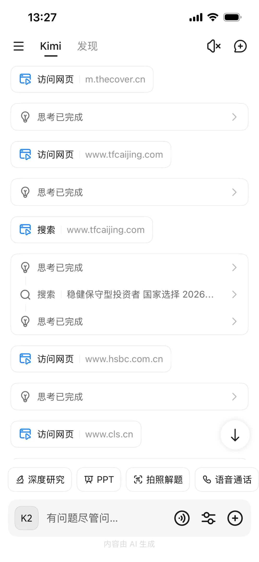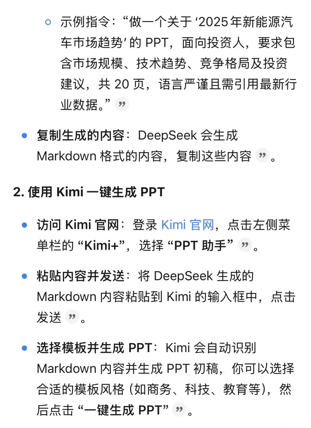 是的,没错,今天当我打开Kimi看到有“PPT”按键的时候就已经按捺不住了。我在手机上用Kimi APP生成投资建议时,脑子里就一直在想,该给Kimi推送个怎样的指令让它一键生成PPT呢。