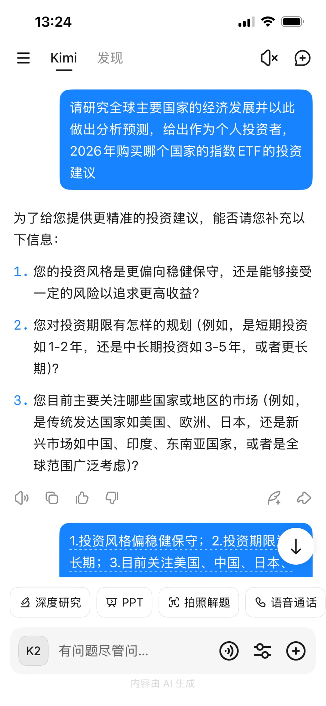 把问题抛给Kimi后,Kimi并没有直接给出我要的投资鉴于建议。不得不说,2.5版本的Kimi非常老到,在给出投资建议前先问了我三个对于投资决策非常重要的问题:1.我的风险偏好;2.期望的投资周期;3.重点关注国家。