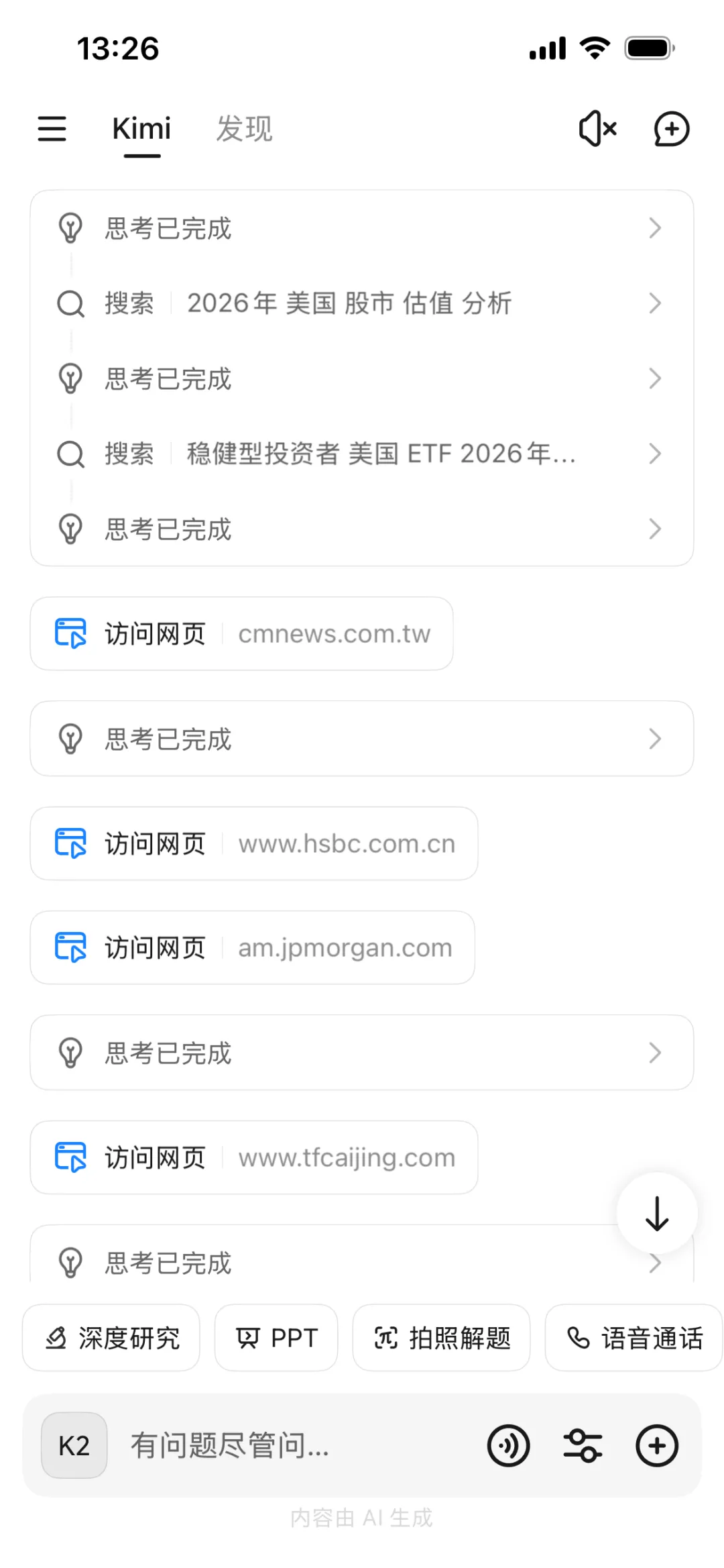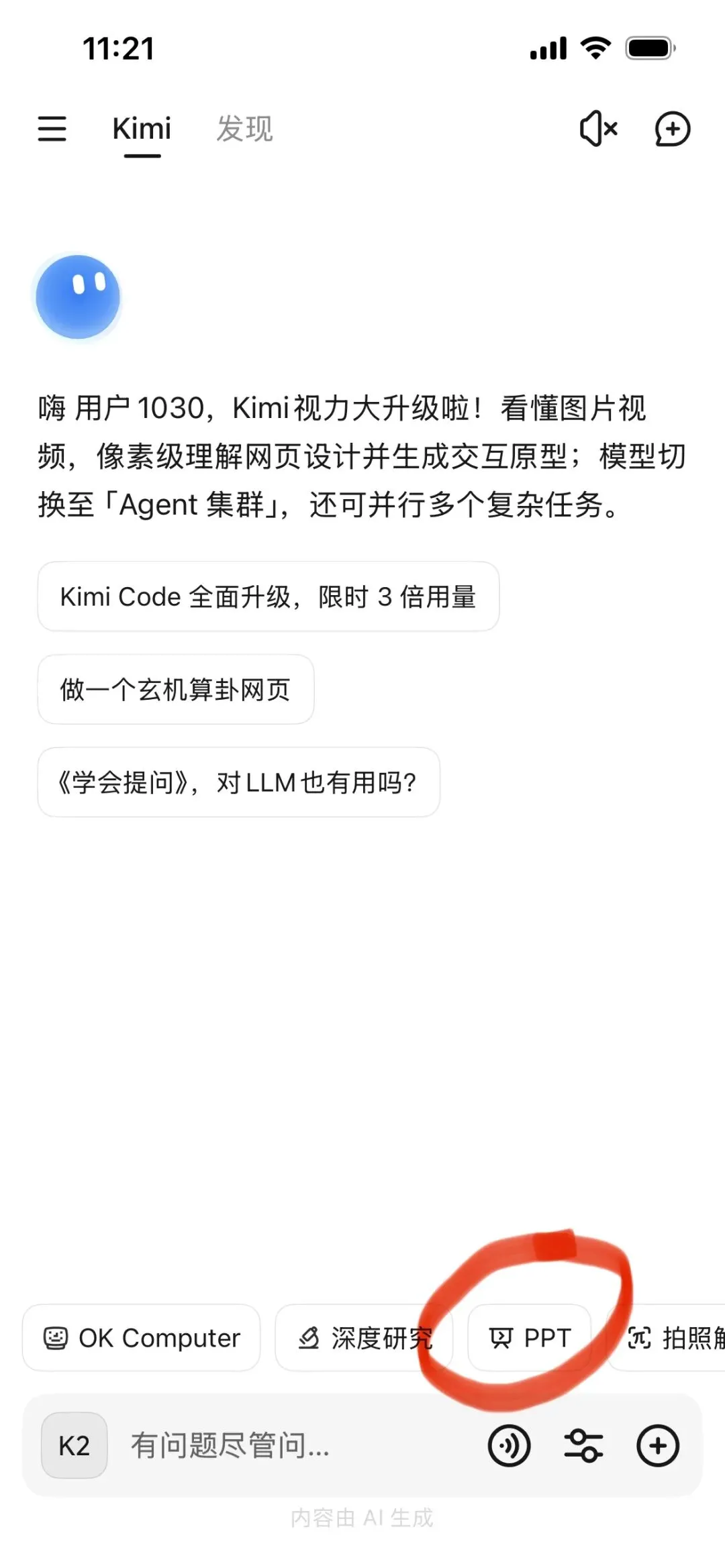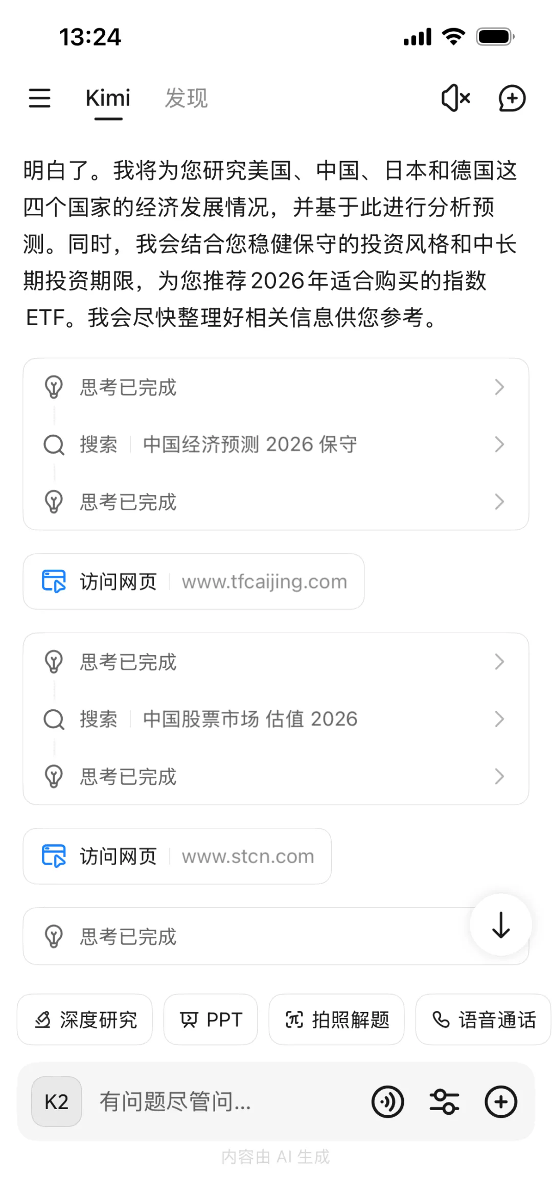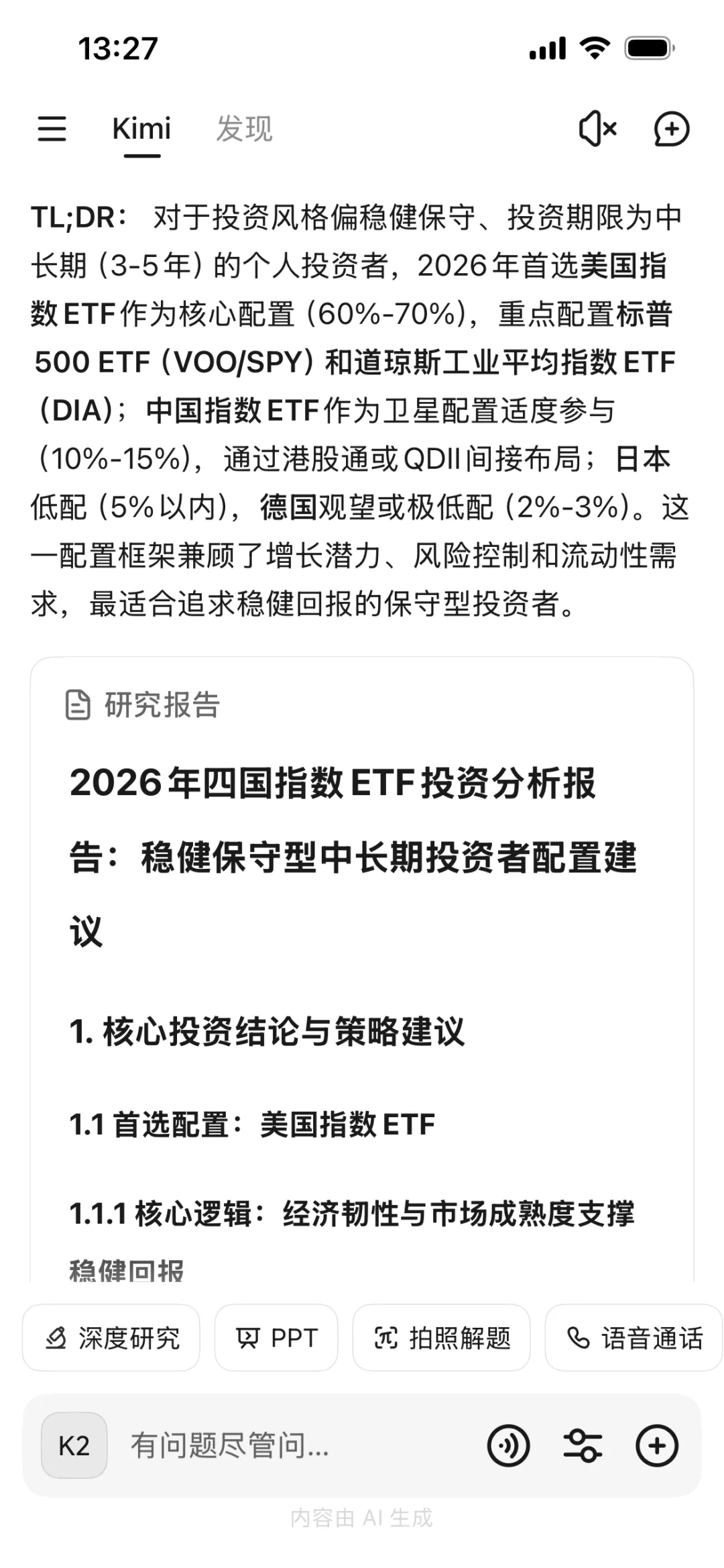 打开Kimi APP,还没输入问题呢就发现了“PPT”按键。果然,Kimi已经升级到2.5版了,早不是去年那个找不到“一键生成PPT”的Kimi啦。按压住自己激动的内心,先问问Kimi要不要买德国ETF吧。
