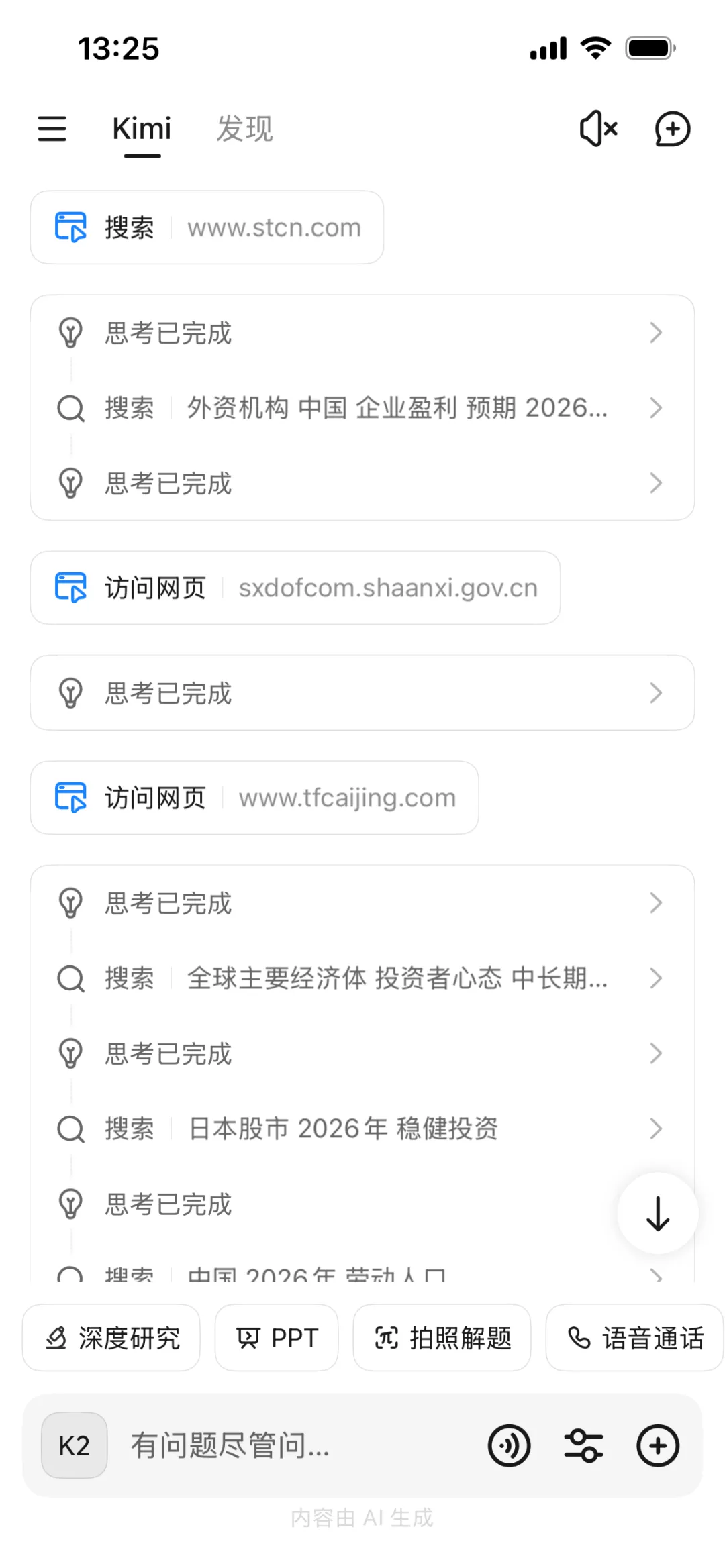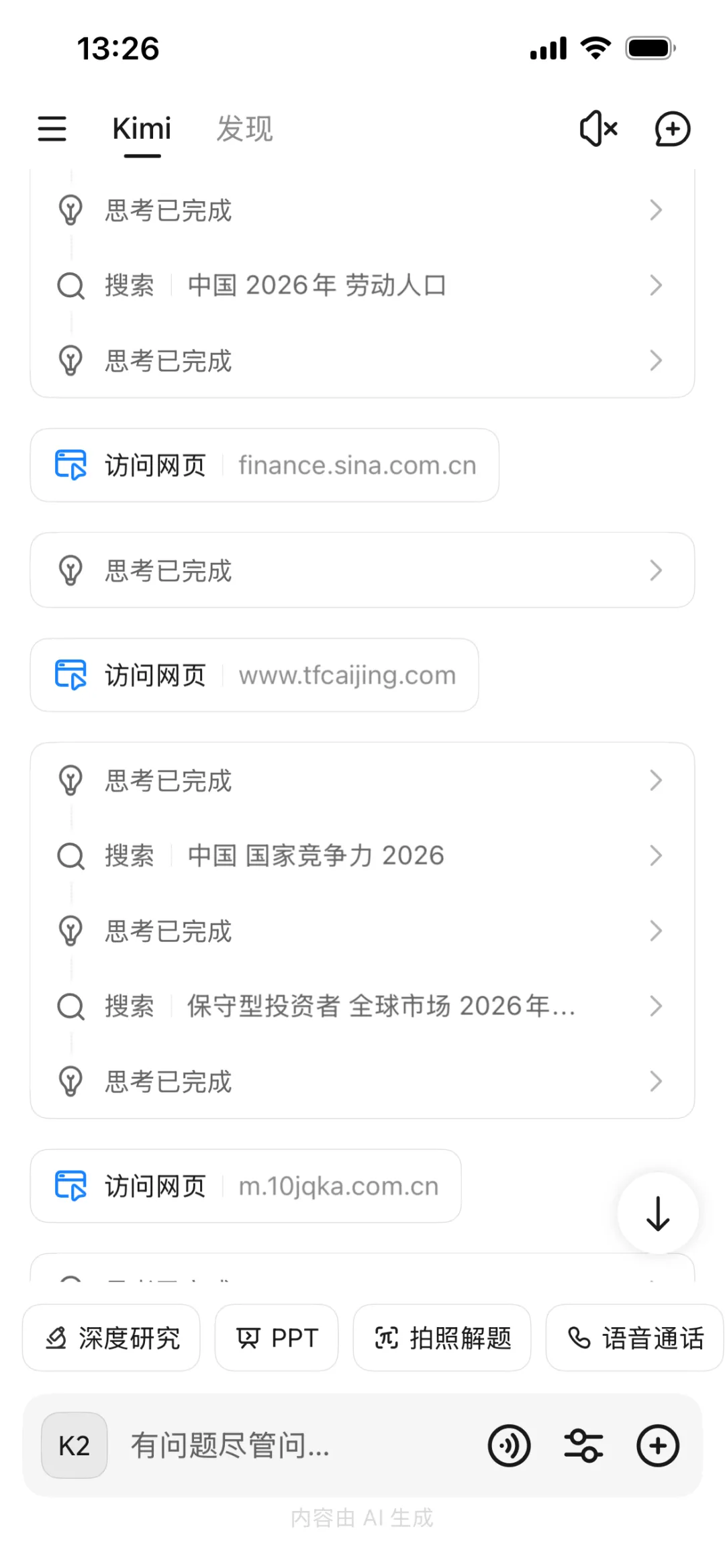 虽然我对Kimi最终会给出个怎样的报告并没有多大的期盼,但其思考过程确实让我感到了AI的实质性进步。Kimi把它的每个思考(工作)过程都展示了出来,比如它搜索了多个关键词的组合,并访问了多个网页。