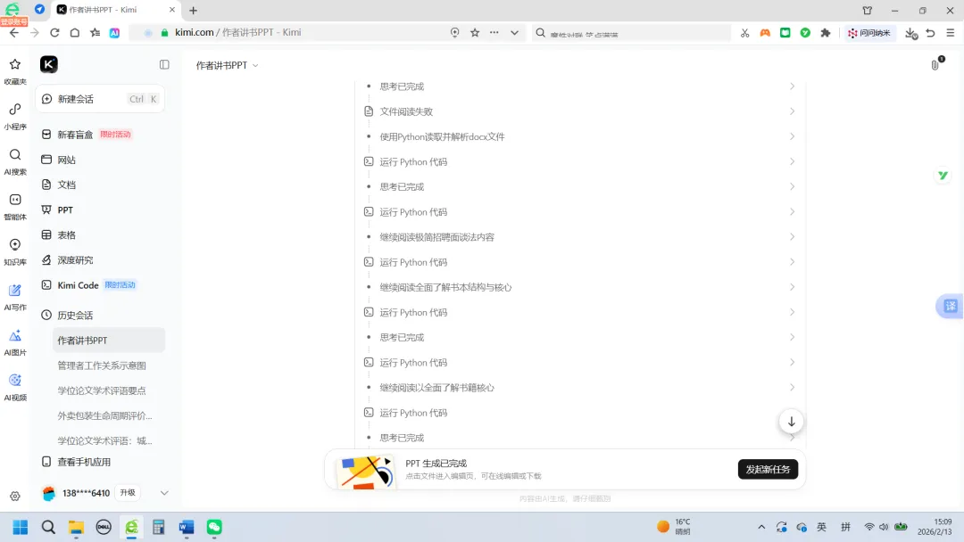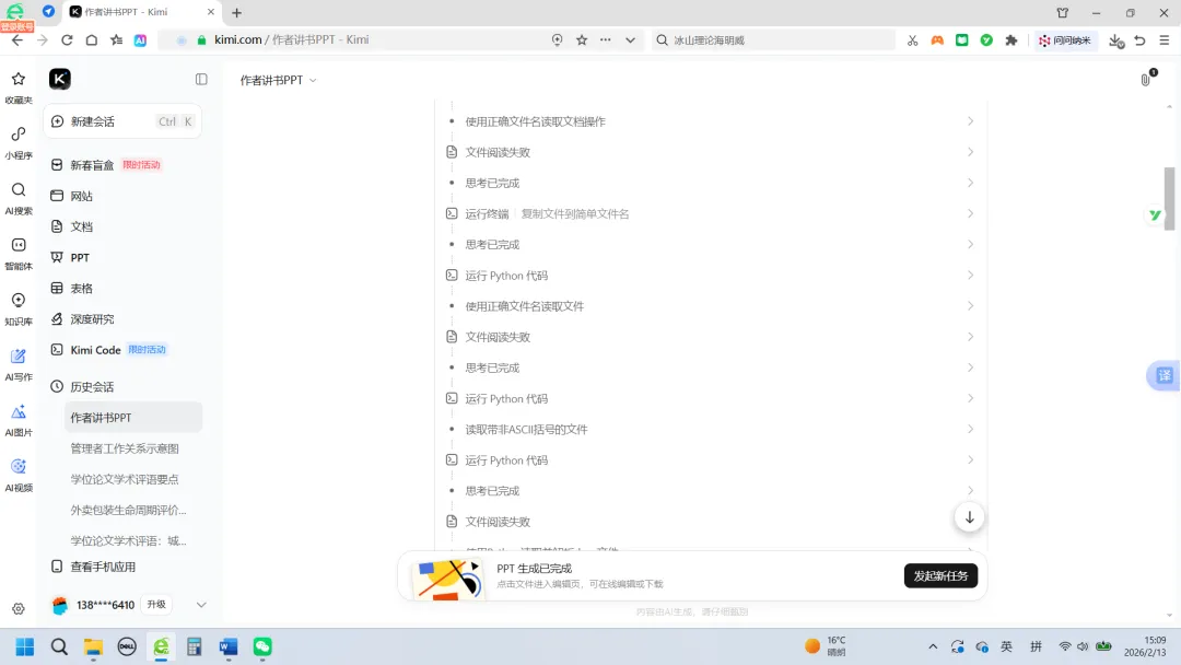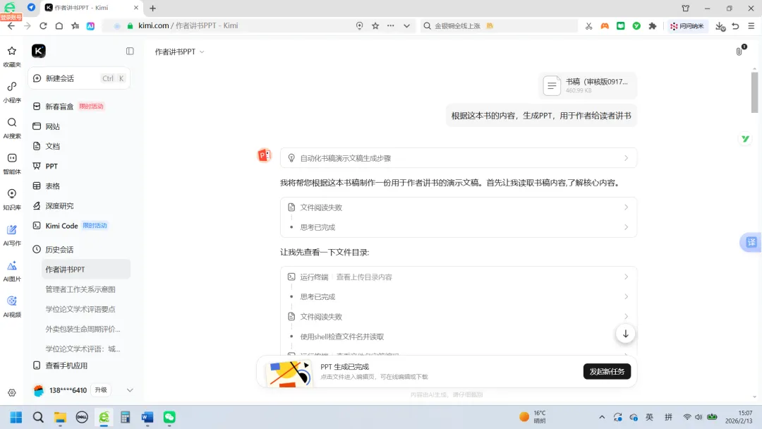 对于进步了的Kimi来说,目前已经不用给它投喂现成的PPT大纲了,只要告诉它你想做什么就可以。于是我就看到了一个进步了的Kimi开始读我喂给它的书(word版),很显然,它读取这个文件失败了。