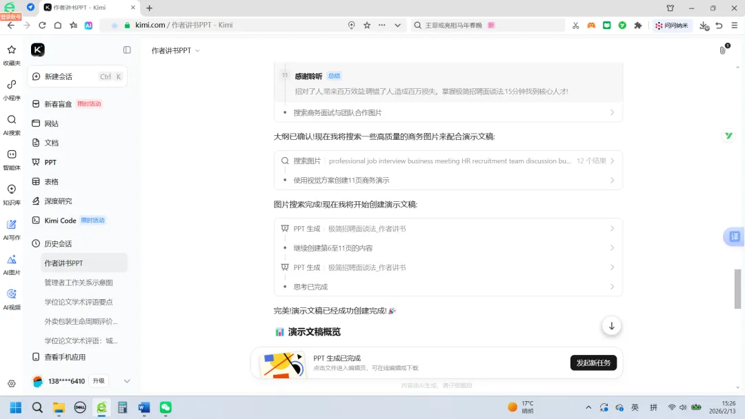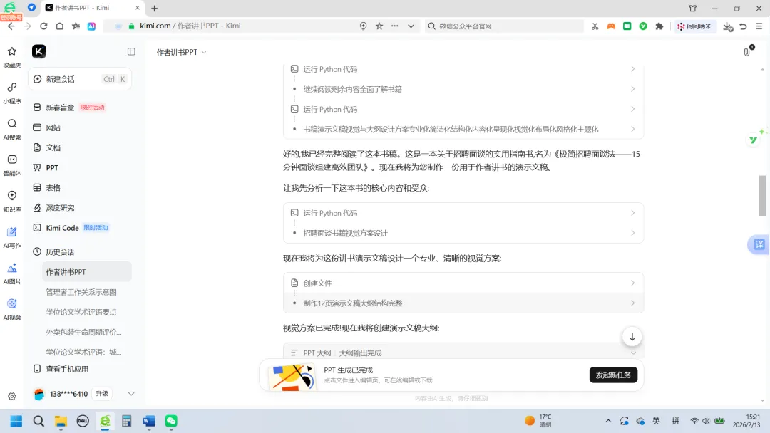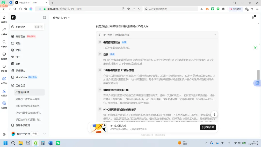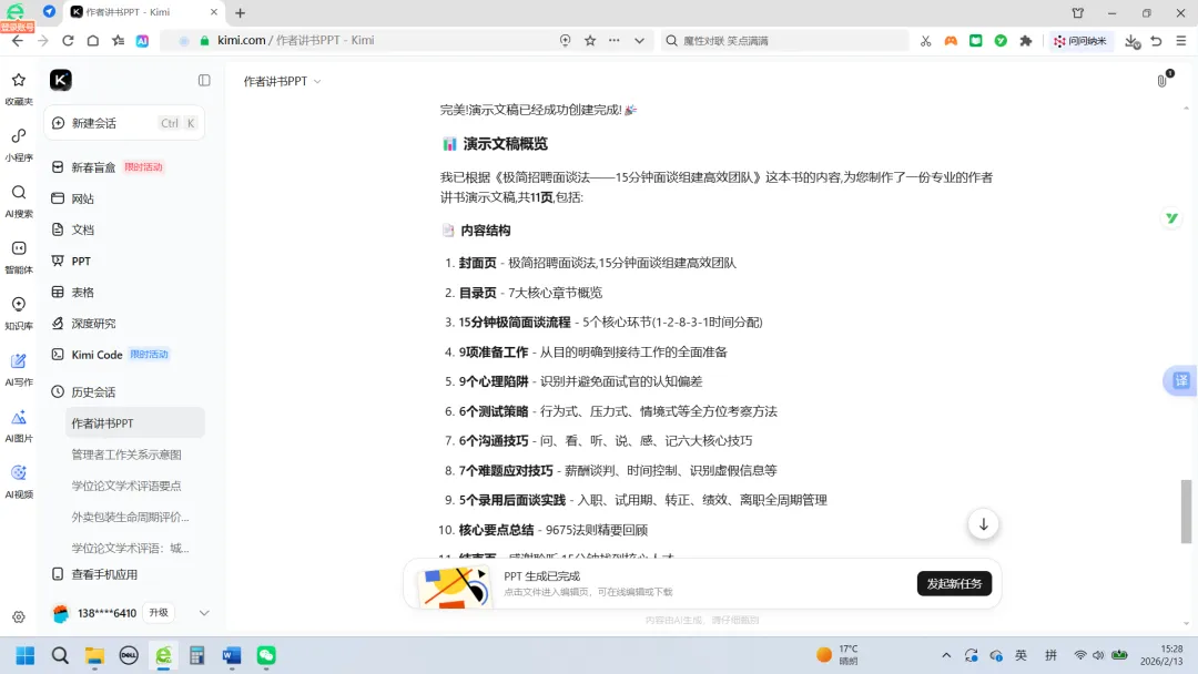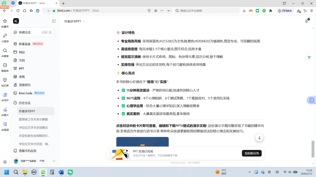 于是,我在PC端的Kimi浏览界面,把《极简招聘面谈法:15分钟面谈组建高效团队》一书的电子版(word)直接投喂给了Kimi,然后告诉它:根据这本书的内容,生成PPT,用于作者给读者讲书。