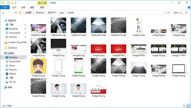 得到一系列文件夹,在「PPT/media」文件夹里,就能看到 PPT 文件中使用的所有图片!