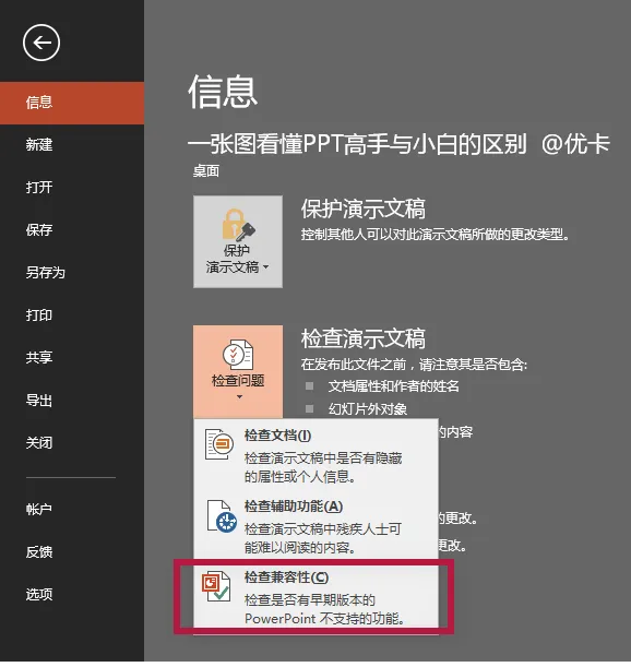 为了确保演示效果不出意外,我们可以对做好的幻灯片检查其兼容性。单击【文件】菜单,【检查问题】中的第三个【检查兼容性】。