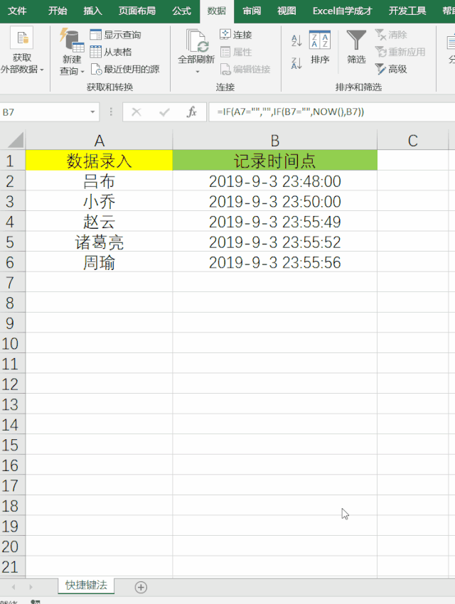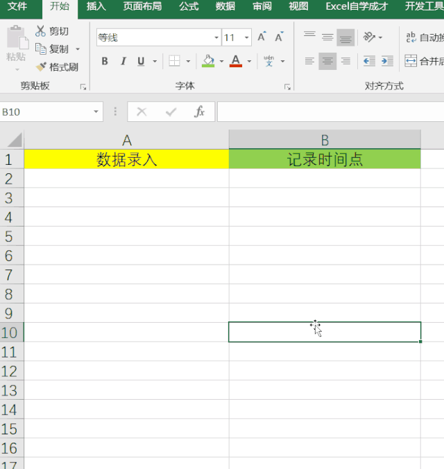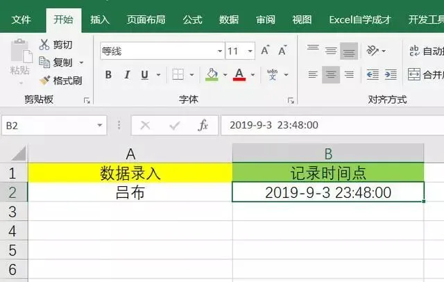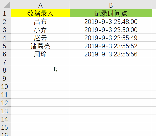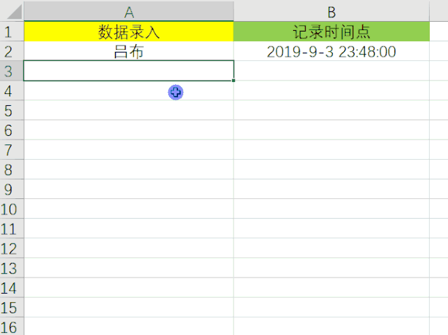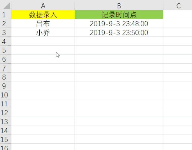 如此即可设置完成,当在A列中输入内容之后,B列时间点即可自动进行记录了,效果如下: