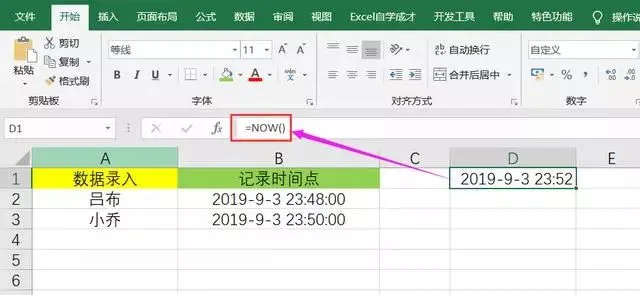 ❶首先在一个空白区域,如D1单元格中,输入公式:=now()