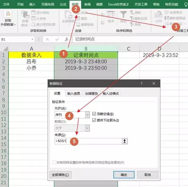 ❷之后选中B列,以找到数据验证,选择序列,数据选择为D1单元格。