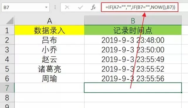 首先在B7单元格中,输入公式为:=IF(A7="","",IF(B7="",NOW(),B7)),之后向下填充公式。