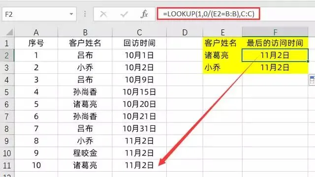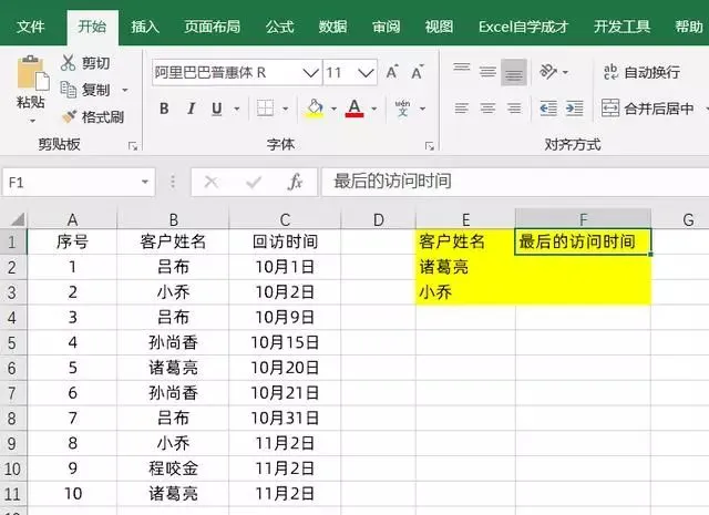 如下表,左边是客户信息表,需查找出客户最后的回访时间。
