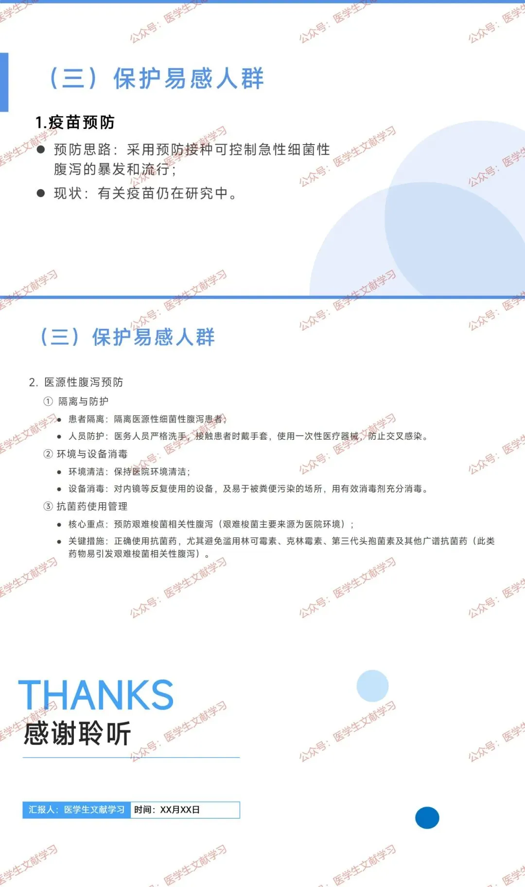 保护易感人群:疫苗仍在研究中;医院内加强隔离防护(医务人员洗手、戴手套),环境及医疗器械消毒;合理使用广谱抗生素,预防艰难梭菌感染。