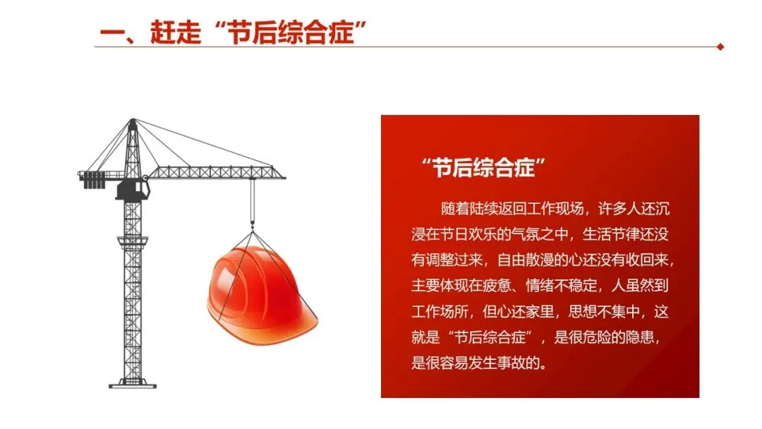 上好开工安全第一课 把好安全第一关 为防止出现节后员工安全意识懈怠的情况,加强安全管控,部署节后工作重点,加强全员安全意识的树立,为新一年安全工作开好头、起好步! 要牢固树立“开工第一件事就是讲安全、抓安全”的思想,扎实开展好活动,教育动员全体员工切实增强安全意识、迅速进入工作状态,严防复工复产期间各类生产安全事故发生。