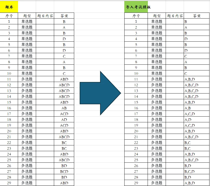 典型的场景是——题库处理。很多考试系统导入题目时,要求答案格式必须是“A,B,C,D”这种带逗号的模板。手动改几千道题?