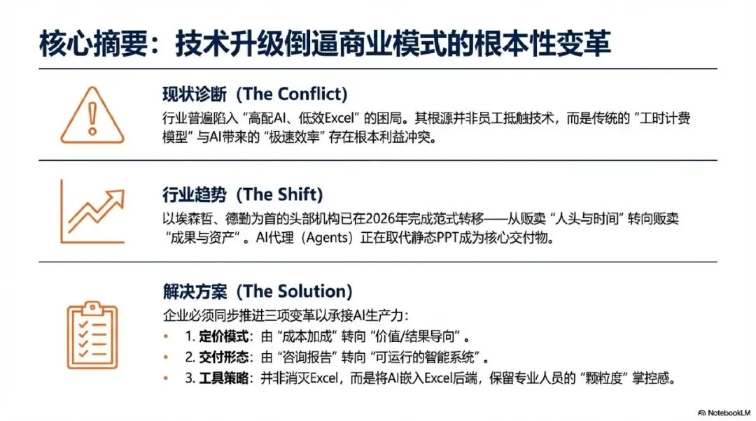 将“审定表”或“报告”作为最终交付物,这些静态内容极易被AI替代,如果老板只给了AI“引擎”,却没给员工“新的赛道”(如可交互的决策模型或风险权重逻辑设定),员工就没有动力放弃Excel去使用AI。