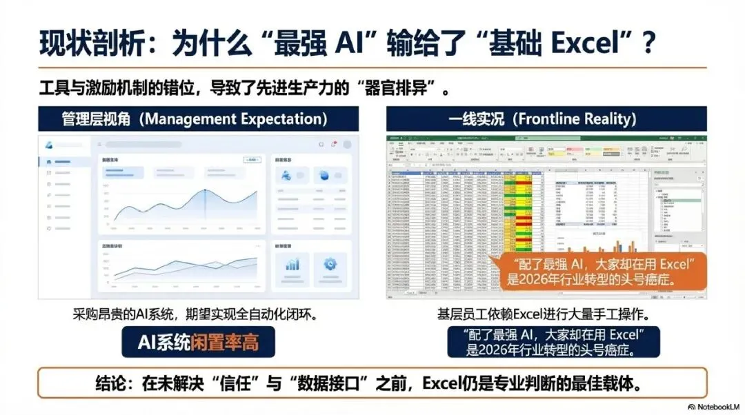 AI系统追求“全自动化闭环”,只给出最终结果而不展示过程。对于需要签字负责、承担法律责任的合伙人来说,看不见逻辑推导过程的AI是不可信的,他们必须回到Excel中找回“一切尽在掌握”的安全感。