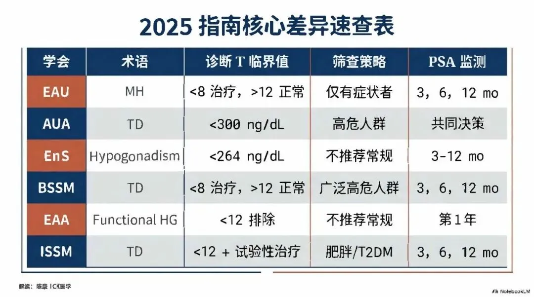 >PPT l 指南解读:男性性腺功能减退症~各专业学会诊断标准的差异(2025CK)