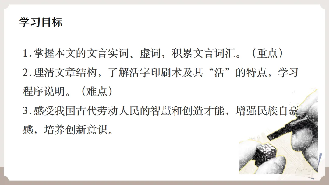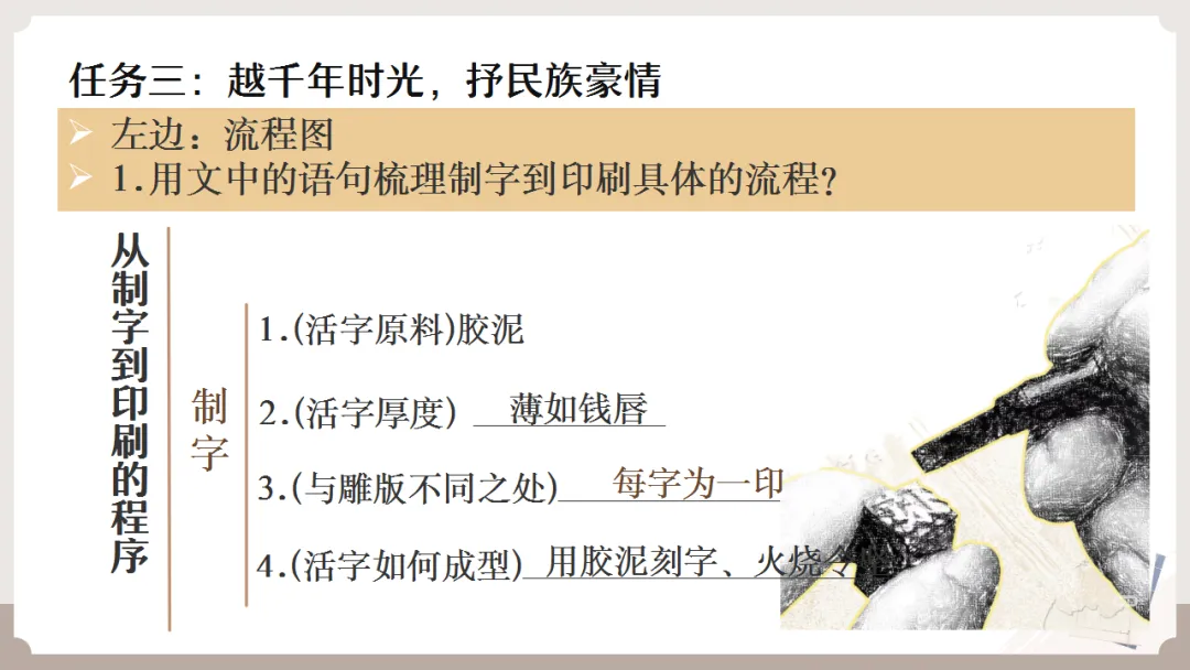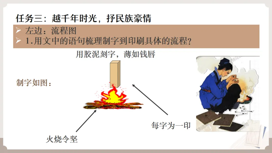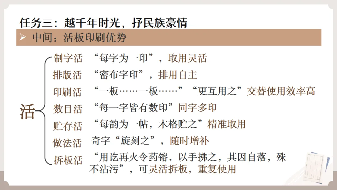 2.理清文章结构,了解活字印刷术及其“活”的特点,学习程序说明。(难点)