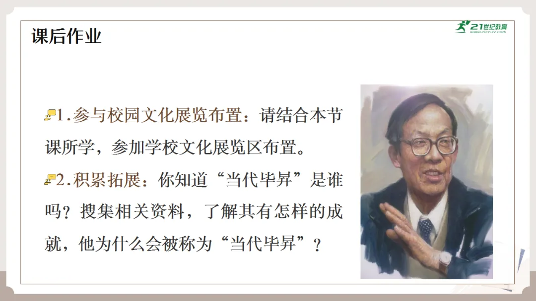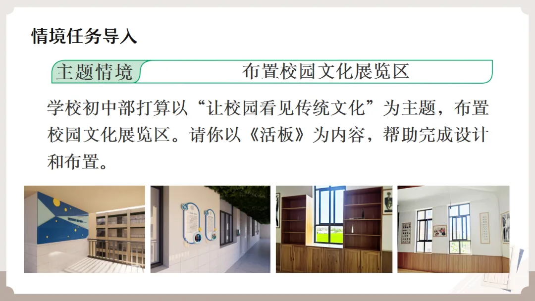 1.参与校园文化展览布置:请结合本节课所学,参加学校文化展览区布置。