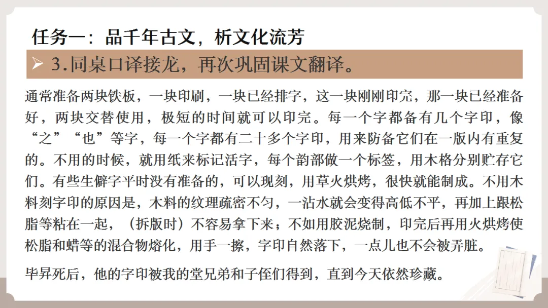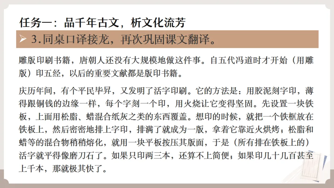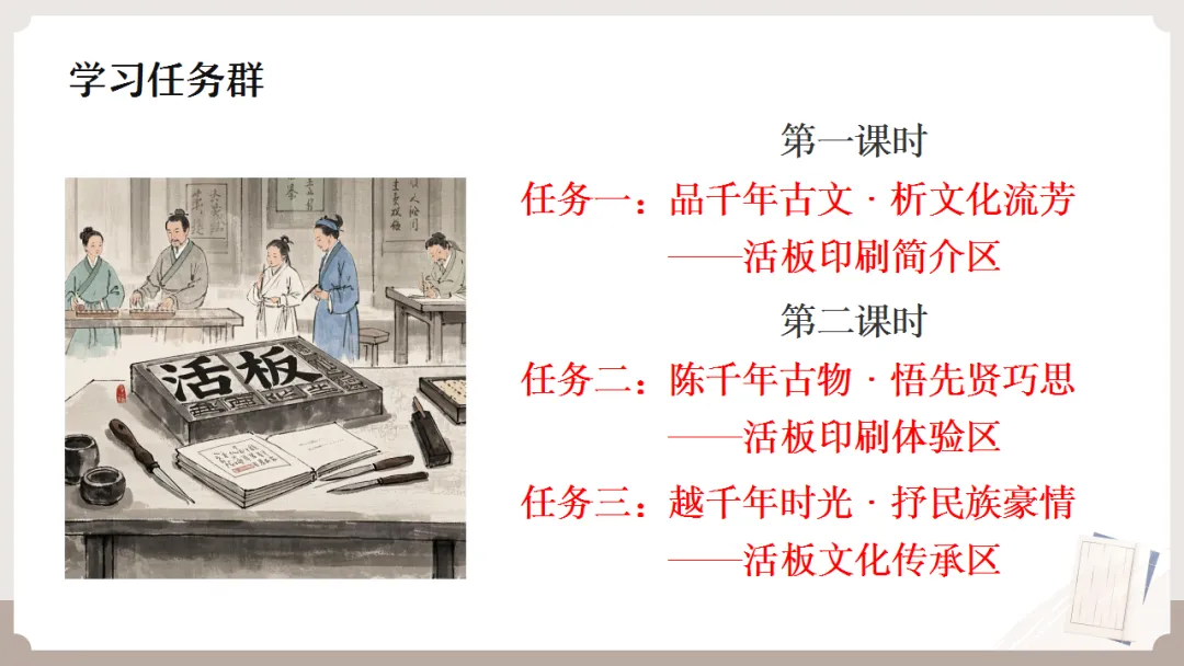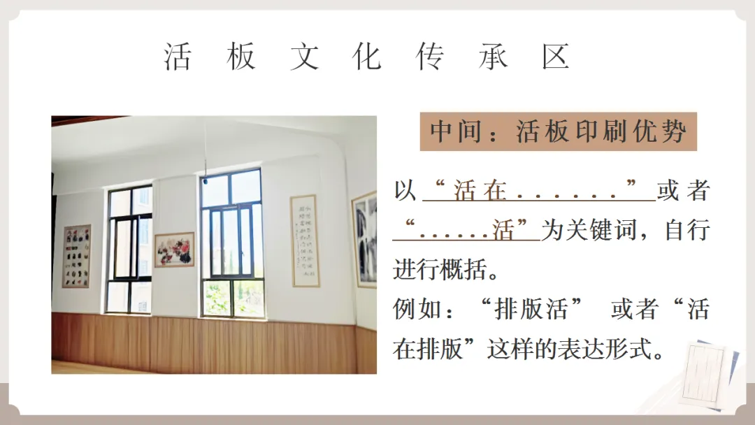 学校初中部打算以“让校园看见传统文化”为主题,布置校园文化展览区。请你以《活板》为内容,帮助完成设计和布置。