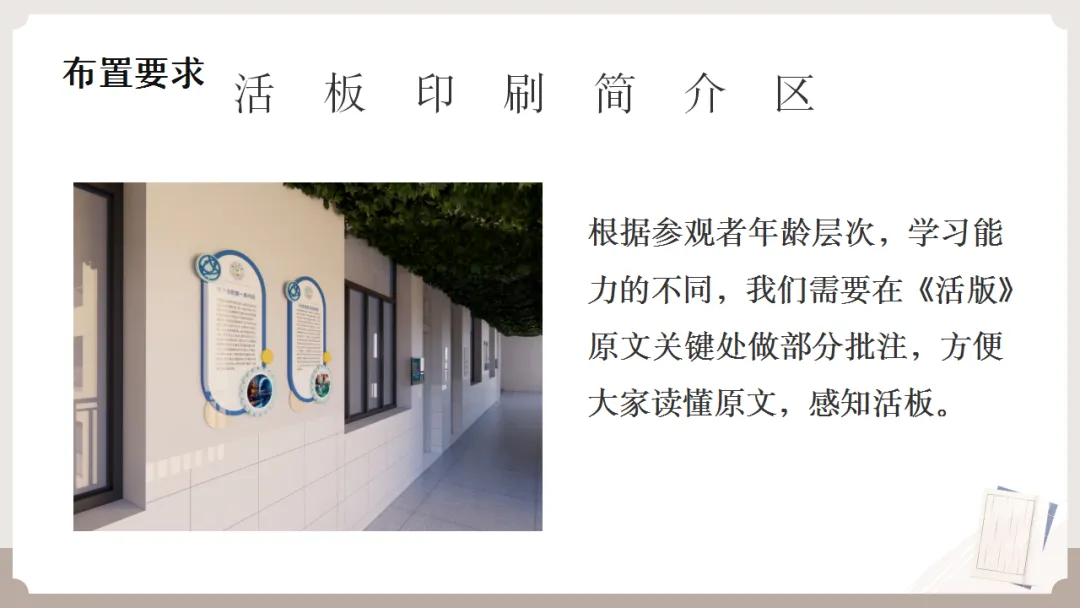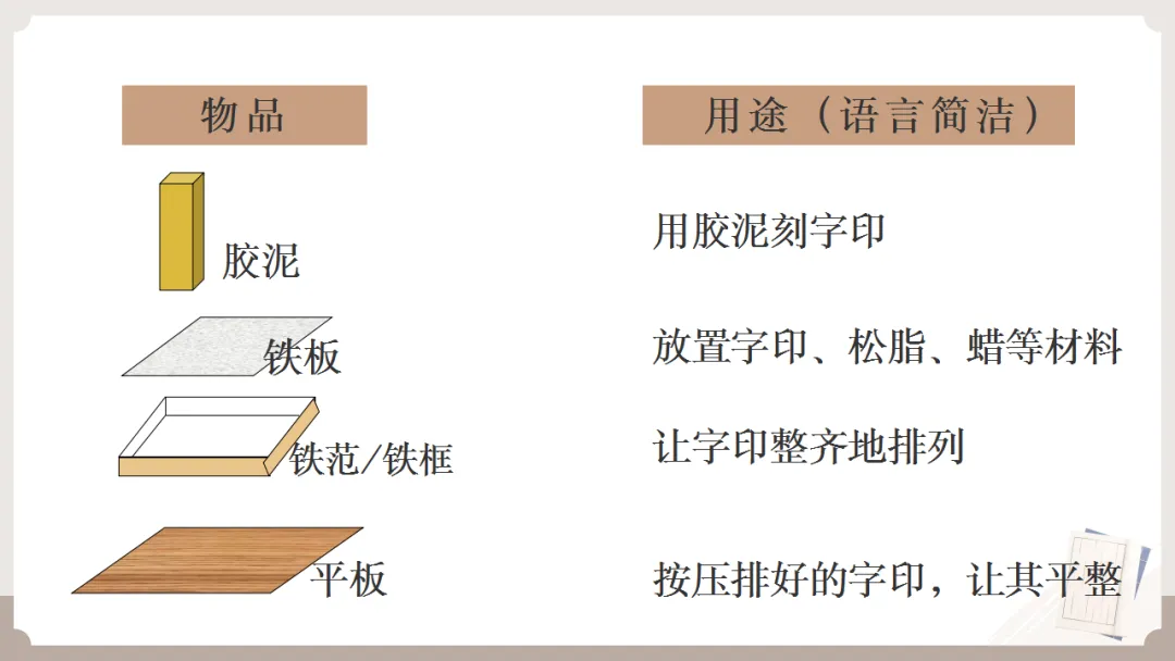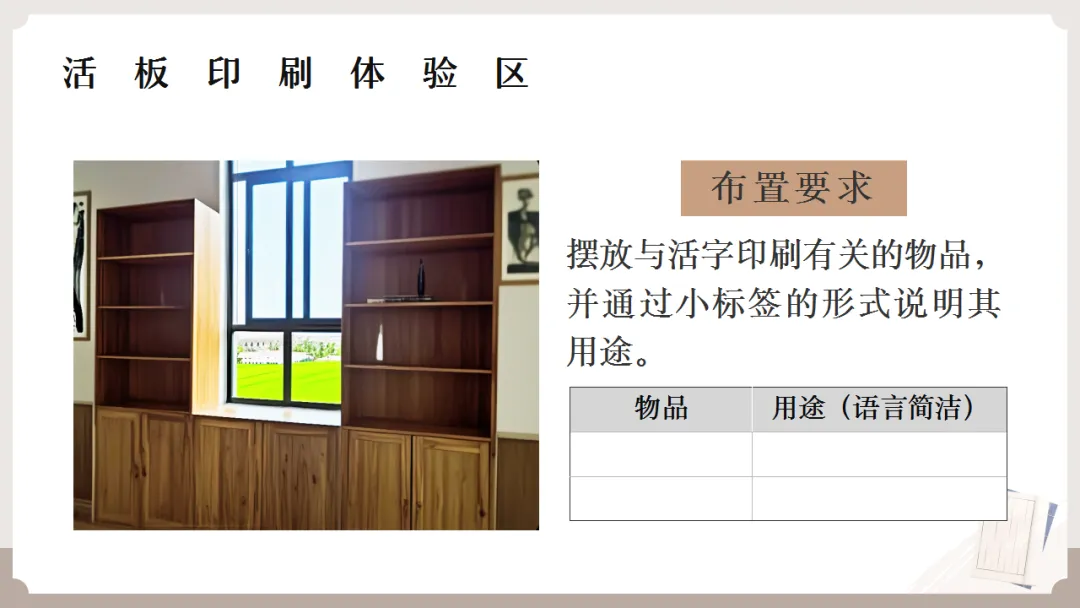 布置要求:摆放与活字印刷有关的物品,并通过小标签的形式说明其用途。
