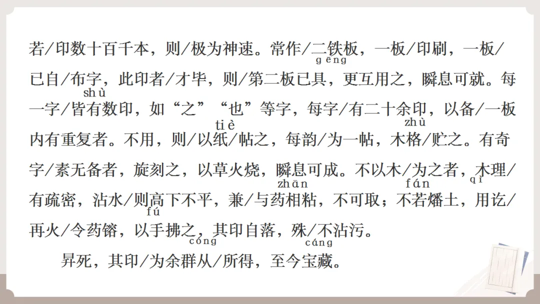 庆历中,有/布衣毕昇,又为/活板。其法:用胶泥/刻字,薄如/钱唇,每字/为一印,火烧/令坚。先设一铁板,其上/以松脂、蜡和纸灰之类/冒之。欲印,则/以一铁范/置铁板上,乃/密布字印,满铁范/为一板,持/就火/炀之,药稍镕,则/以一平板/按其面,则/字平如砥。若/止印三二本,未为简易;若/印数十百千本,则/极为神速。常作/二铁板,一板/印刷,一板/已自/布字,此印者/才毕,则/第二板已具,更互用之,瞬息可就。每一字/皆有数印,如“之”“也”等字,每字/有二十余印,以备/一板内有重复者。不用,则/以纸/帖之,每韵/为一帖,木格/贮之。有奇字/素无备者,旋刻之,以草火烧,瞬息可成。不以木/为之者,木理/有疏密,沾水/则高下不平,兼/与药相粘,不可取;不若燔土,用讫/再火/令药镕,以手拂之,其印自落,殊/不沾污。