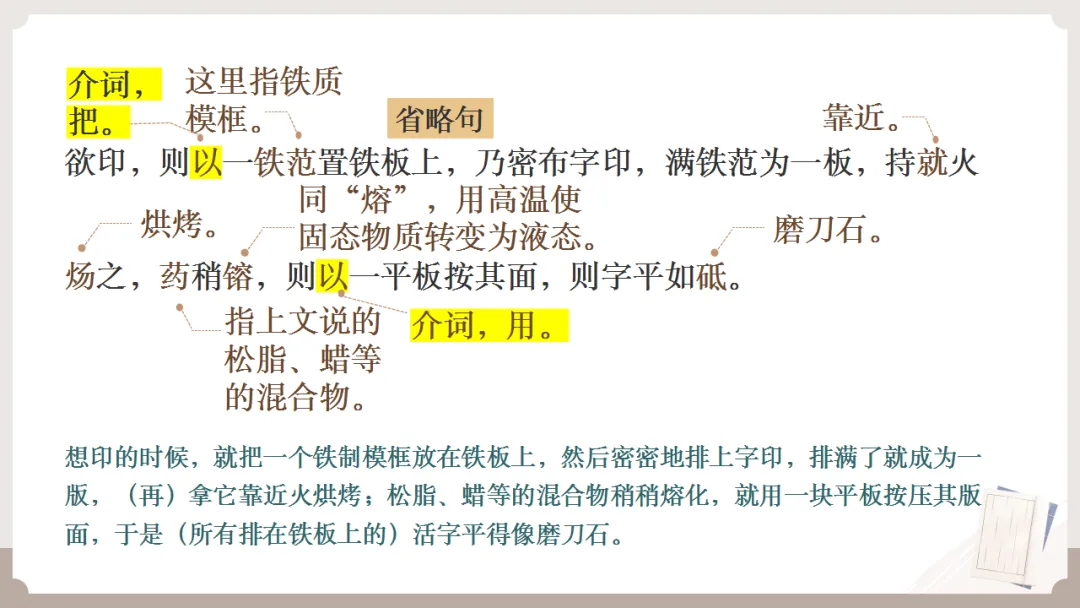 庆历年间,有个平民毕昇,又发明了活字印刷。它的方法是:用胶泥刻字印,薄得跟铜钱的边缘一样,每个字刻一个印,用火烧让它变得坚固。先设置一块铁板,上面用松脂、蜡混合纸灰之类的东西覆盖。想印的时候,就把一个铁框放在铁板上,然后密密地排上字印,排满了就成为一版,拿着它靠近火烘烤;松脂和蜡等的混合物稍稍熔化,就用一块平板按压其版面,于是(所有排在铁板上的)活字就平得像磨刀石了。如果只印两三本,还算不上简便;如果印几十几百甚至上千本,那就极其快了。通常准备两块铁板,一块印刷,一块已经排字,这一块刚刚印完,那一块已经准备好,两块交替使用,极短的时间就可以印完。每一个字都备有几个字印,像“之”“也”等字,每一个字都有二十多个字印,用来防备它们在一版内有重复的。不用的时候,就用纸来标记活字,每个韵部做一个标签,用木格分别贮存它们。有些生僻字平时没有准备的,可以现刻,用草火烘烤,很快就能制成。不用木料刻字印的原因是,木料的纹理疏密不匀,一沾水就会变得高低不平,再加上跟松脂等粘在一起,(拆版时)不容易拿下来;不如用胶泥烧制,印完后再用火烘烤使松脂和蜡等的混合物熔化,用手一擦,字印自然落下,一点儿也不会被弄脏。