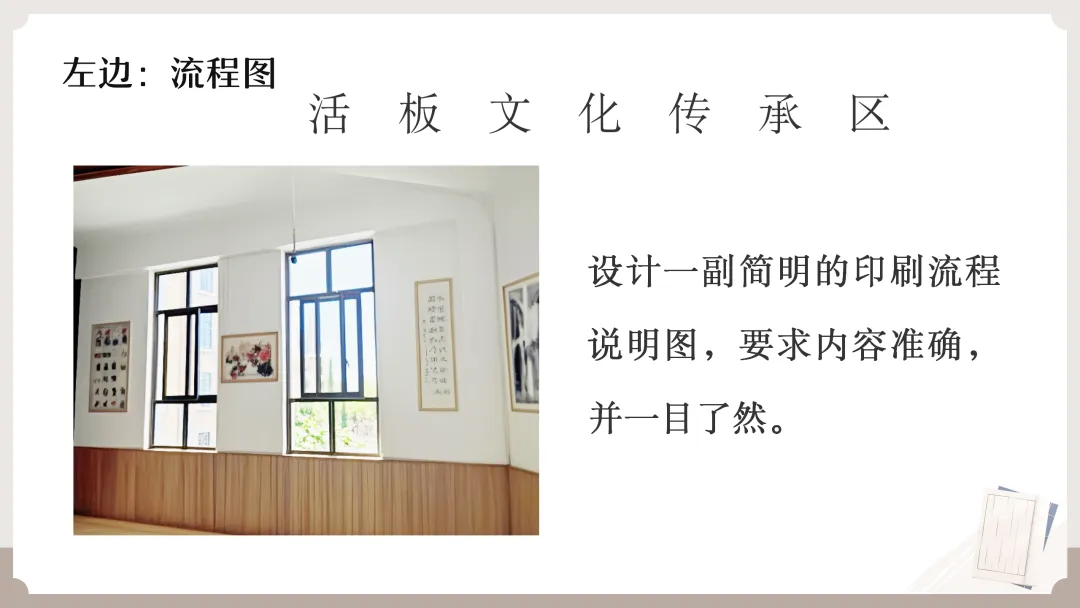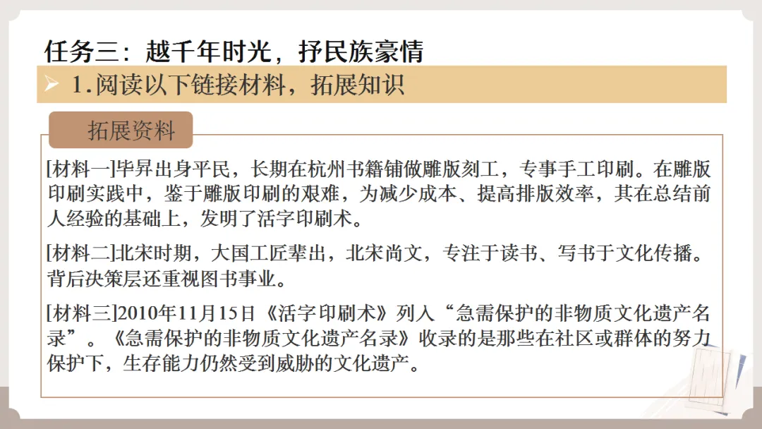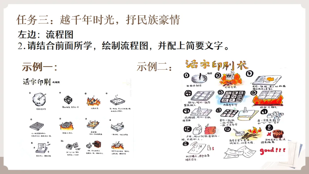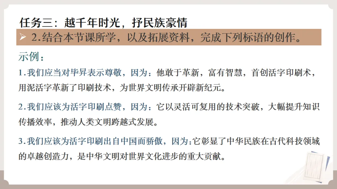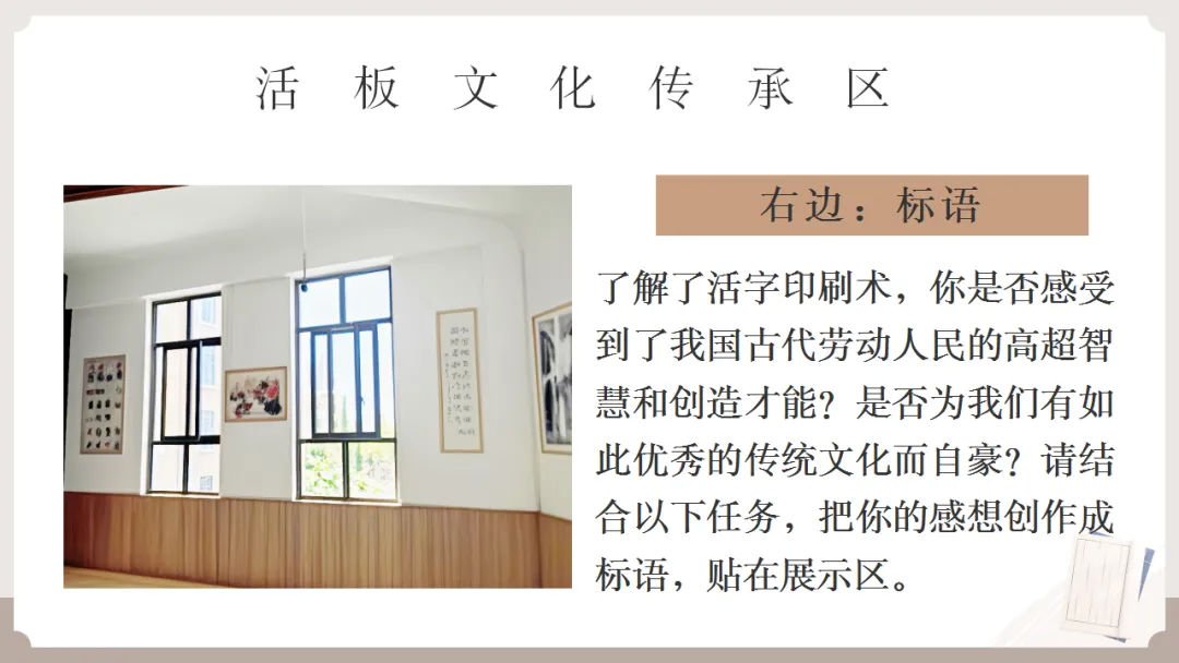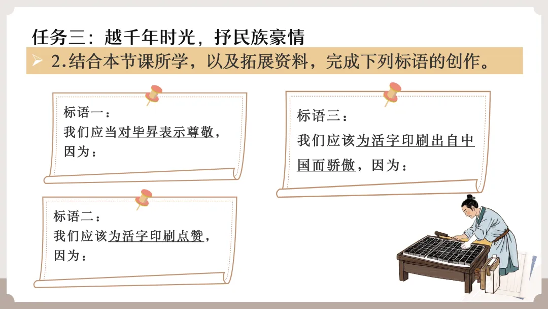了解了活字印刷术,你是否感受到了我国古代劳动人民的高超智慧和创造才能?是否为我们有如此优秀的传统文化而自豪?请结合以下任务,把你的感想创作成标语,贴在展示区。