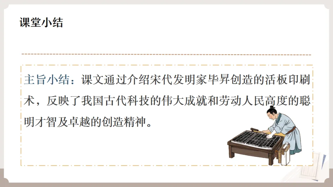 课文通过介绍宋代发明家毕昇创造的活板印刷术,反映了我国古代科技的伟大成就和劳动人民高度的聪明才智及卓越的创造精神。
