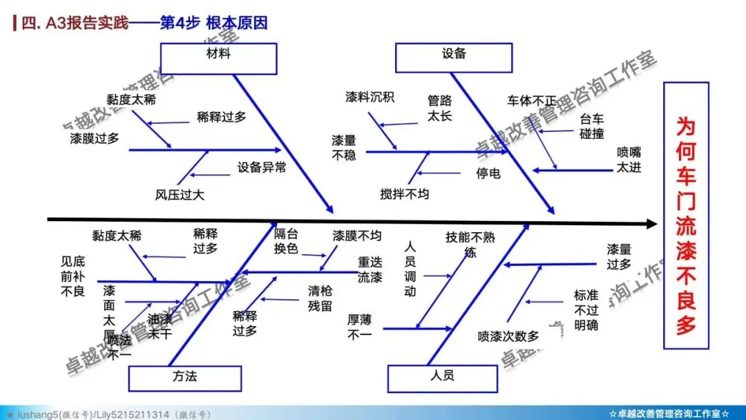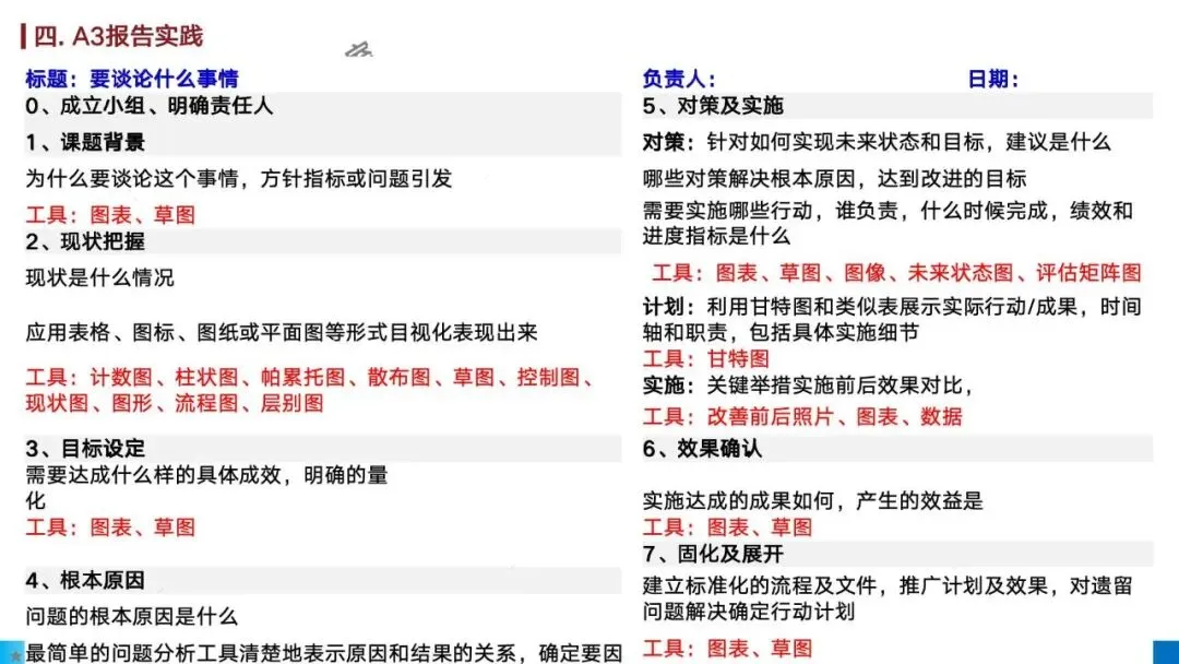 实战要点:千万别把七步法填成“写作文”——现状部分堆不出数据,原因分析直接跳到对策,是A3报告最常见的失败原因。每一步没想透,不急着往下走。