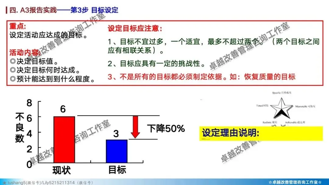 基于现状数据和公司要求,设定具体、可衡量、有挑战性但可达成的指标(如“3个月内将A不良率从5%降至2%”)。