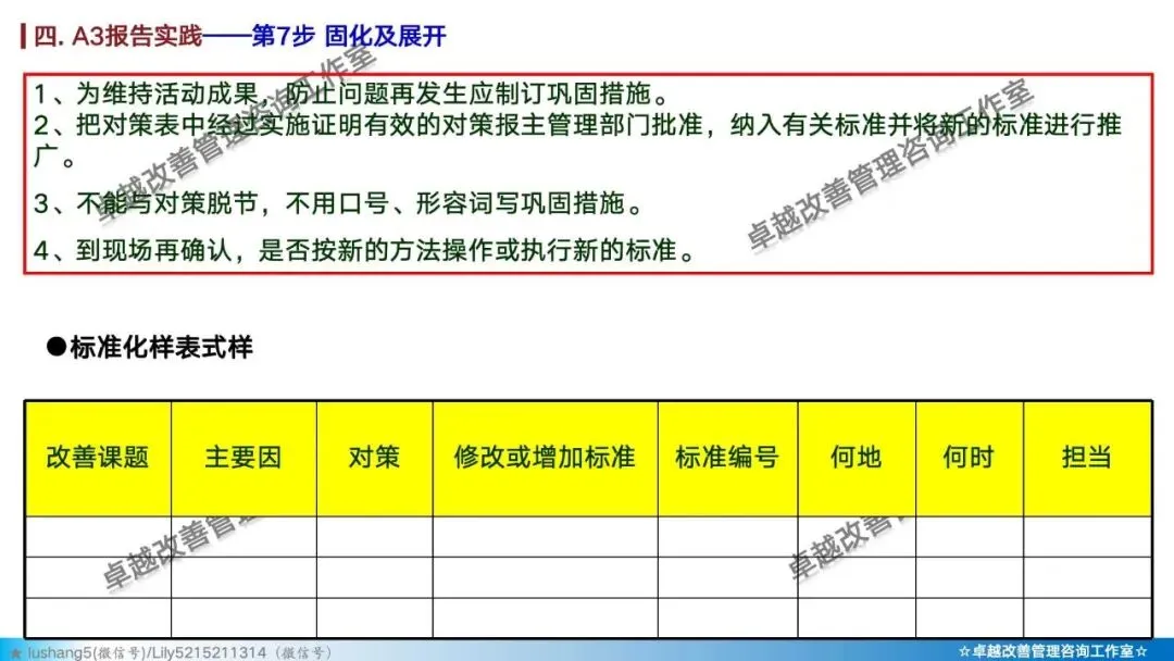 将有效措施纳入作业指导书、培训等制度文件,设定维持检查点,防止问题复发。无标准化,不算解决问题。