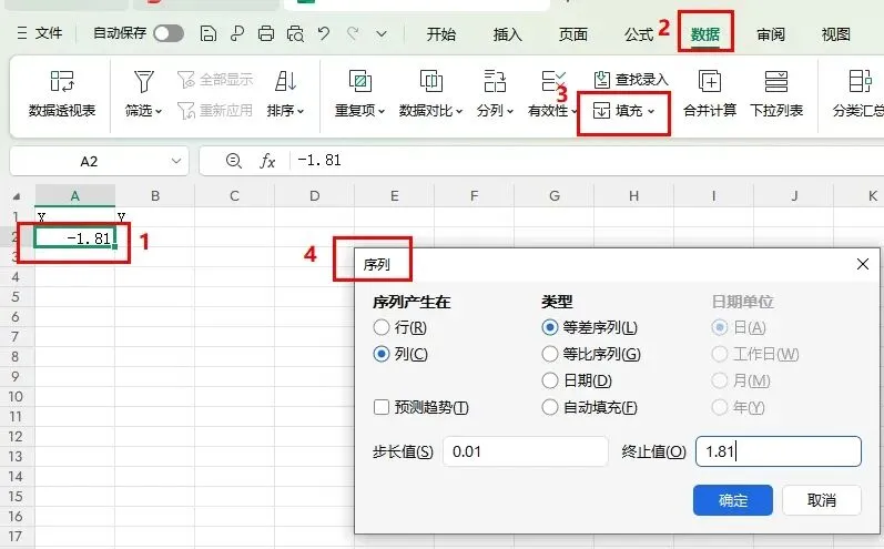 2)依次点击“数据”→“填充”→“序列”,按图示设置序列参数(如步长值、终止值等),生成完整的X值序列。