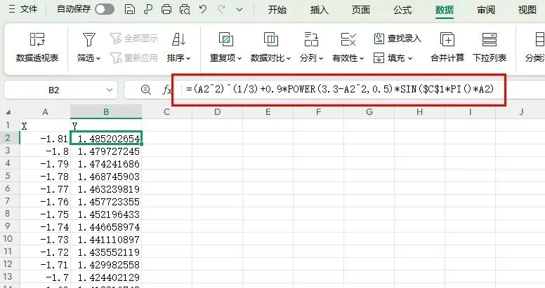 =(A2^2)^(1/3)+0.9*POWER(3.3-A2^2,0.5)*SIN($C$1*PI()*A2)