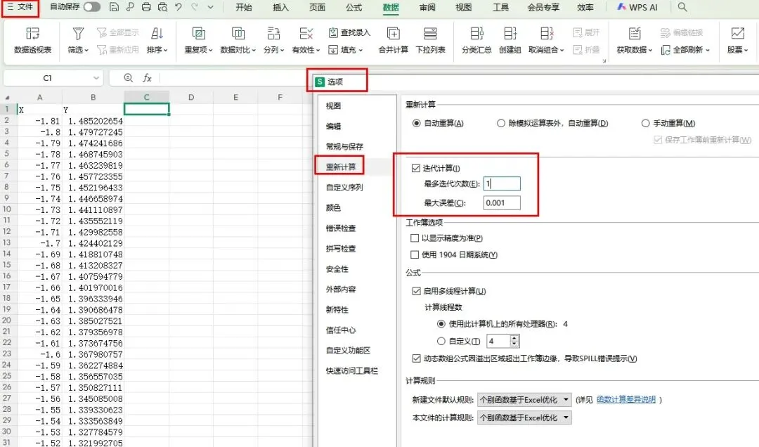 1)启用迭代计算:选中C1单元格,点击“文件” → “选项” → “重新计算”,勾选 “迭代计算”,进行设置(如图)