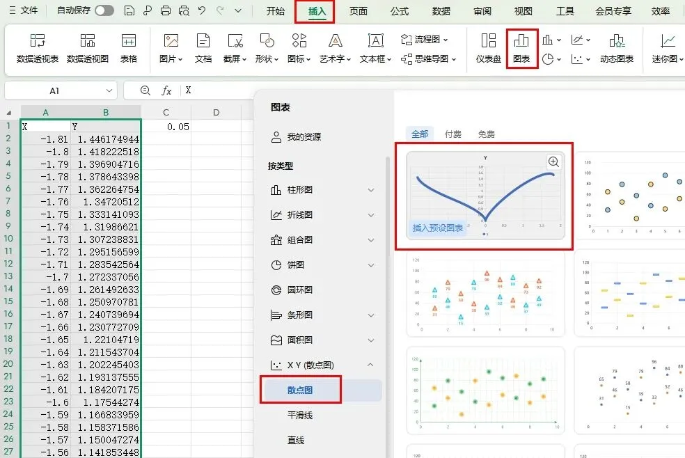 1)选中A列和B列的所有数据,依次点击“插入” → “图表” → “散点图”,生成初始图表。