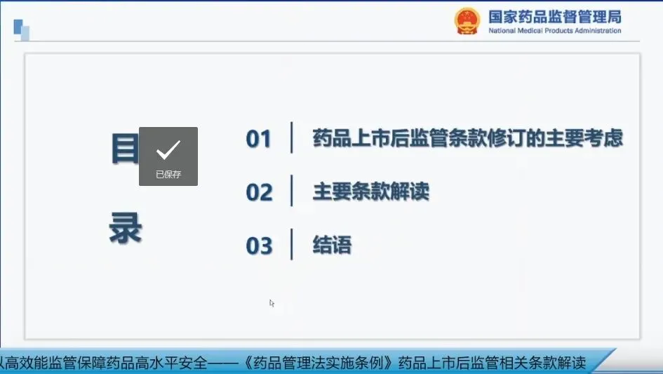 下面由我就新修订的《中华人民共和国药品管理法实施条例》中有关药品上市后监管的重点条款为大家做解读,希望能让大家对条例有更清晰的理解、更深入的认识和更准确的把握。我的讲解主要从以下三个部分展开:一是药品上市后监管条款修订的主要考虑;二是药品上市后监管重点条款解读;三是下一步工作要求。