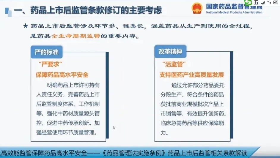 药品上市后监管涵盖药品从生产到使用的全过程,是药品全生命周期监管的重要内容。在条例修订中,我们坚持改革精神和严的标准,统筹发展和安全,坚持严要求与活监管相结合,既要保障药品高水平安全,也要服务医药产业高质量发展,最终实现保障人民群众用药安全、有效、可及的目标。