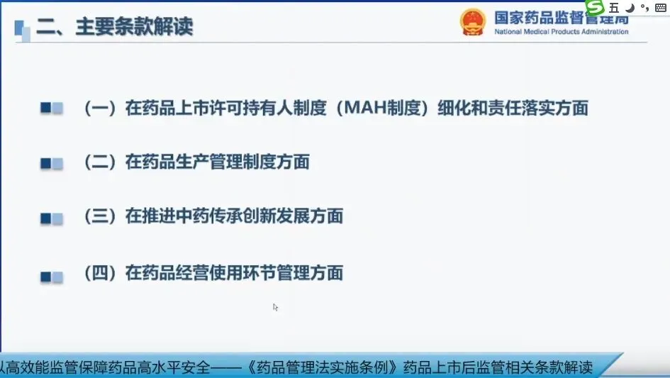 这些制度措施的出台,对进一步提升我国医药产业总体质量安全水平、服务医药产业高质量发展、增强人民群众的获得感,具有重要意义。条例涉及药品上市后监管的内容散布于多个章节,为方便大家理解,接下来我将从四个方面,对重点条款进行集中解读。